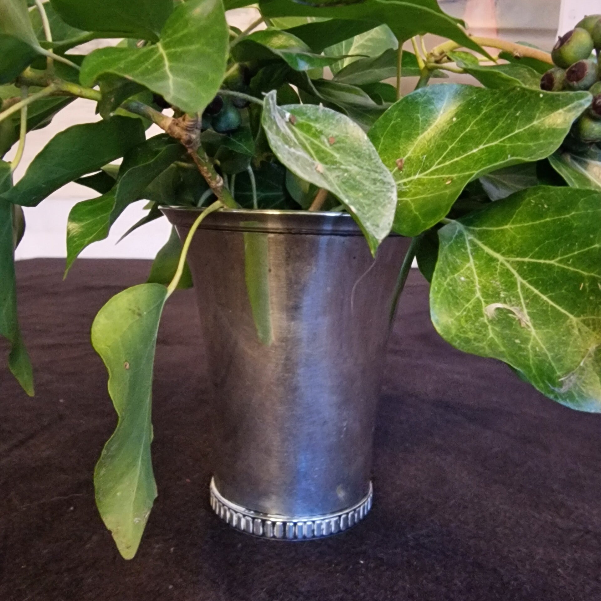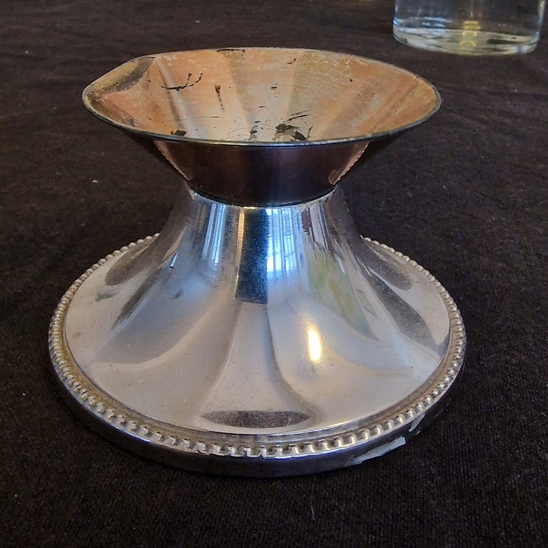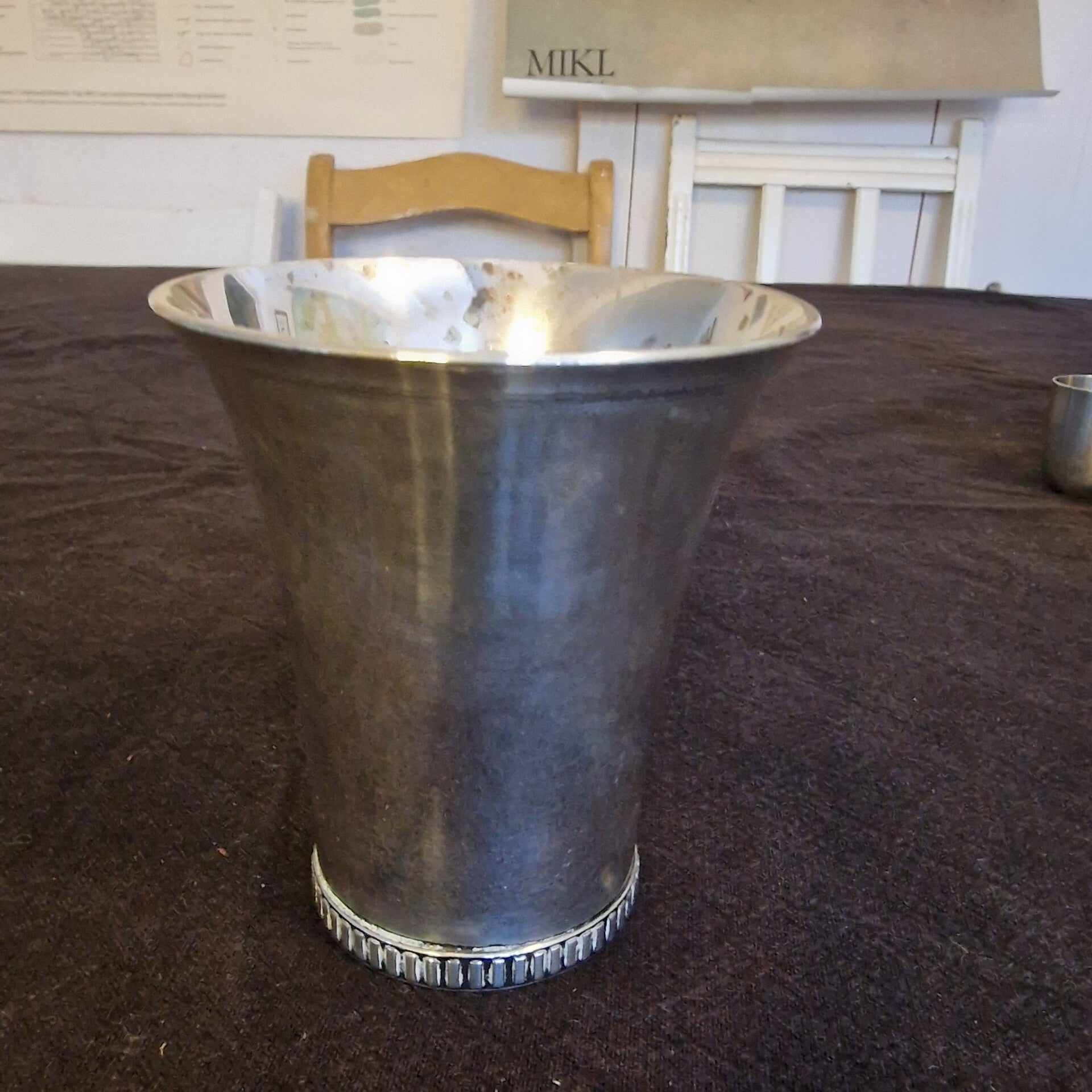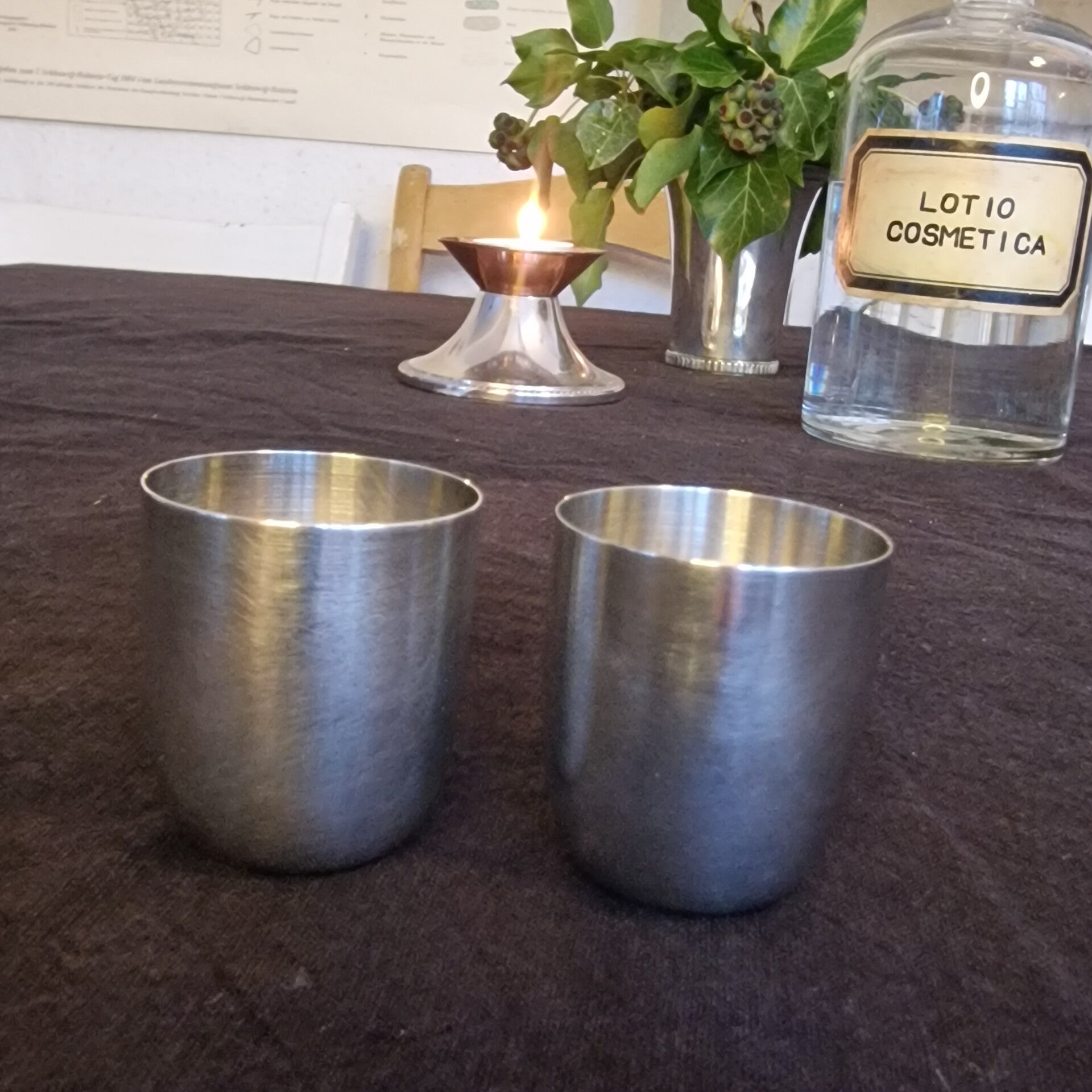 Das Valentinstag-Paket "Camouflage" besteht aus einer Apothekerflasche mit der Nomenklatur Lotio Cosmetica, zwei Schnapsbechern von Wilkens 835/- Silber, einer 10 cm hohen, dänischen 800/- Silbervase und einem Kerzenleuchter mit Perlrand von Wilkens 835/- Silber. Der Kerzenleuchter hat einen 3,5 cm langen Randschaden, was ihn aber sehr charmant wirken läßt.