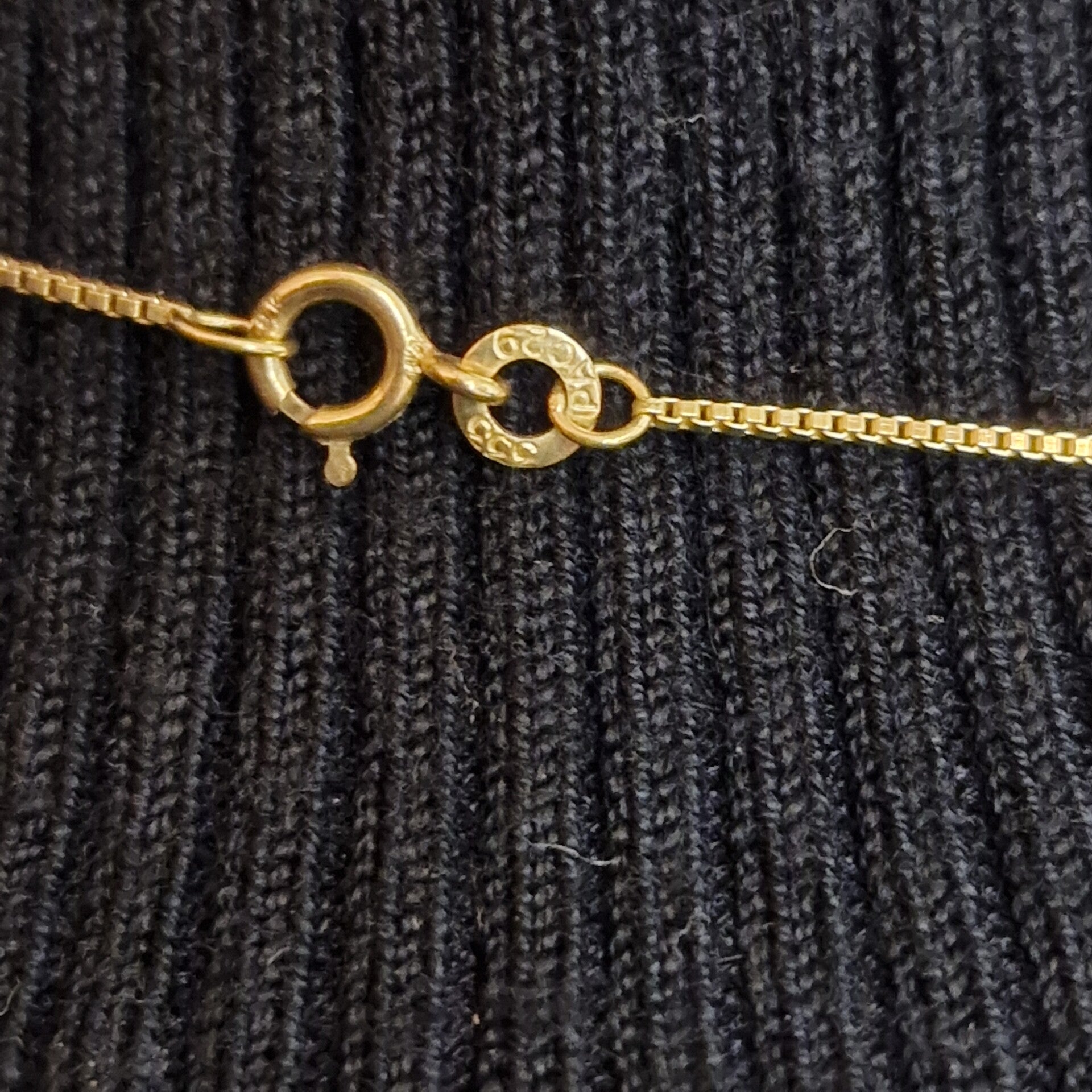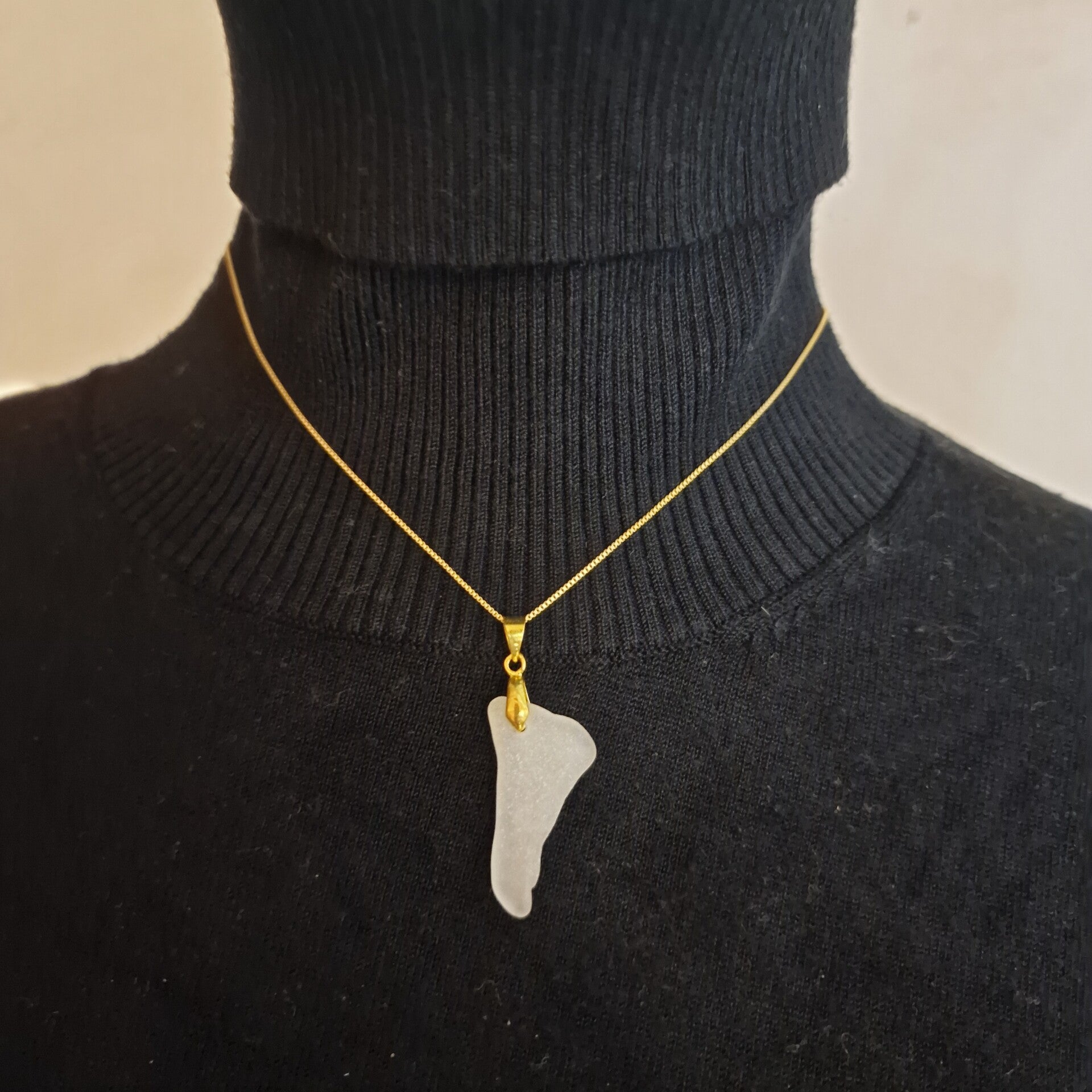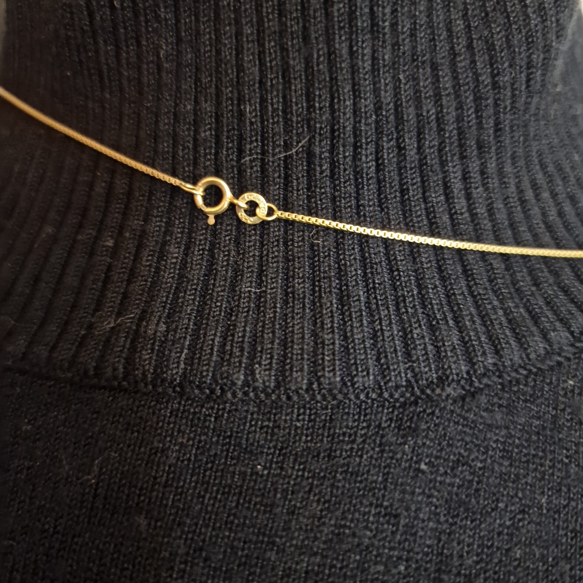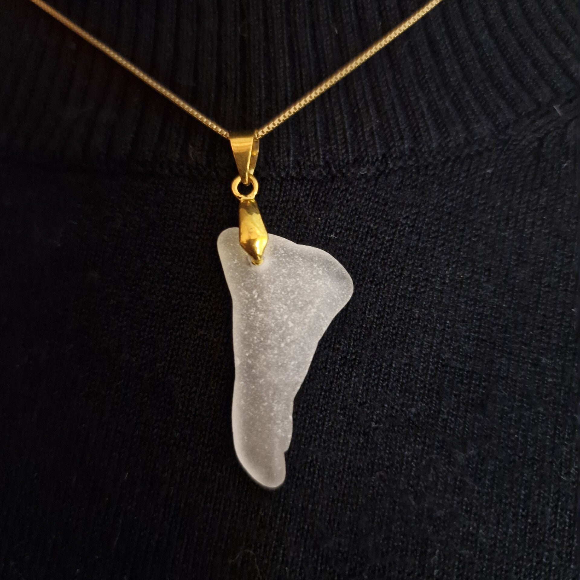 Eine feine 333/- Gelbgoldkette mit Seeglasanhänger, der an die Silhouette einer Insel erinnert. Die Kette hat eine Gesamtlänge von 40 cm und wiegt 1,37 g. Der Anhänger ist 3,3 cm hoch.