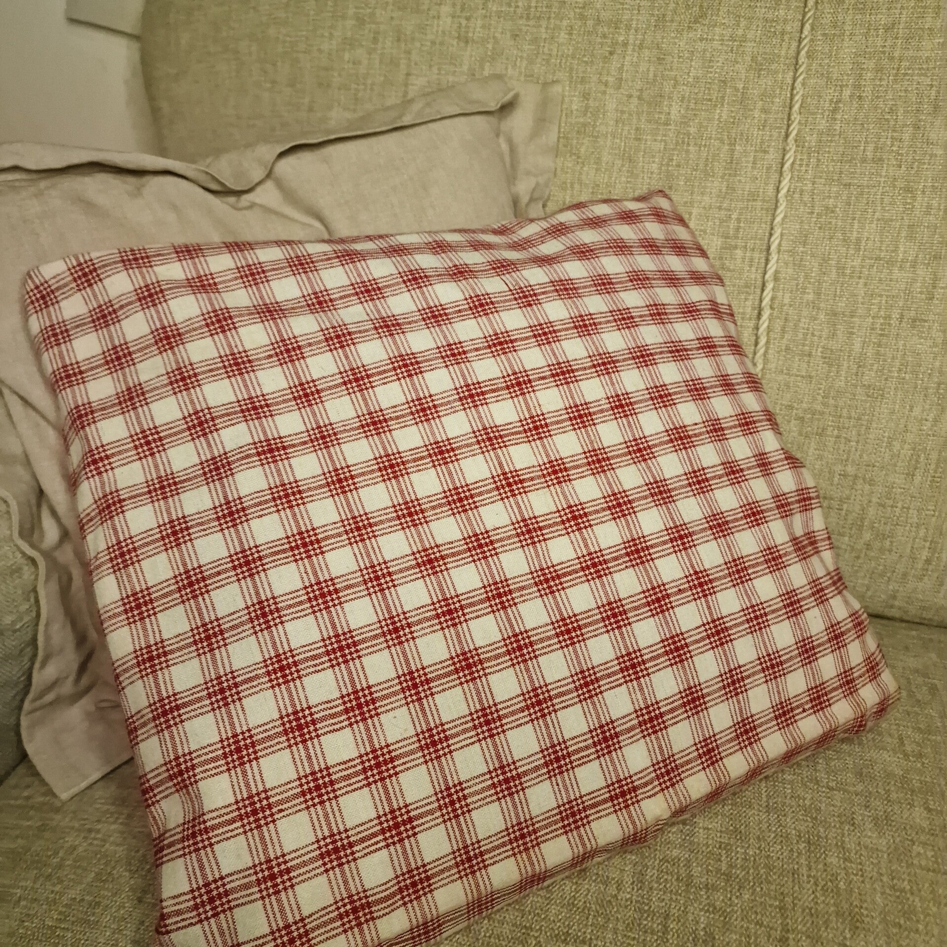 Das Deko-Seegraskissen "Maison Rouge".Es ist 38 x 38 cm groß mit einer 400 g-Füllung.Das Inlett ist aus Baumwolle, der Bezug ist als Hotelbezug aus einem wunderbaren rot-weiß karierten Leinenstoff gefertigt.