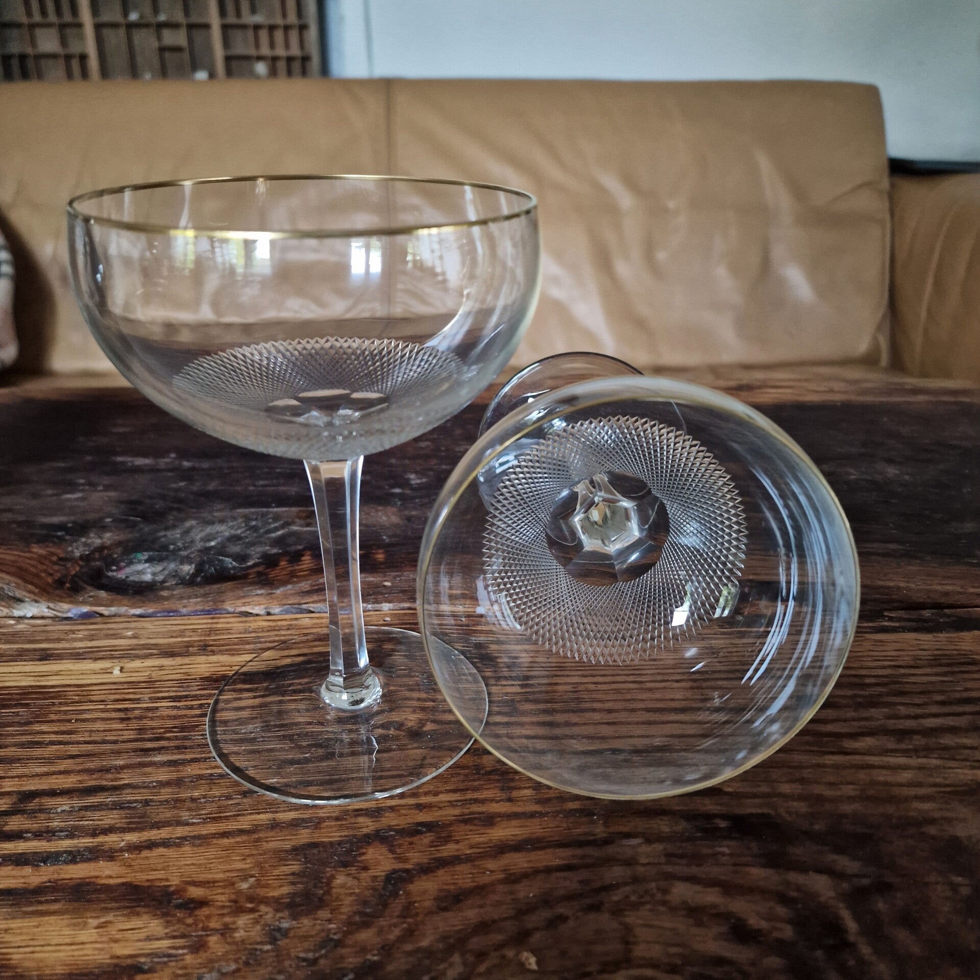 Paar antike Champagner-Schalen mit feinem Schliff und Goldrand.