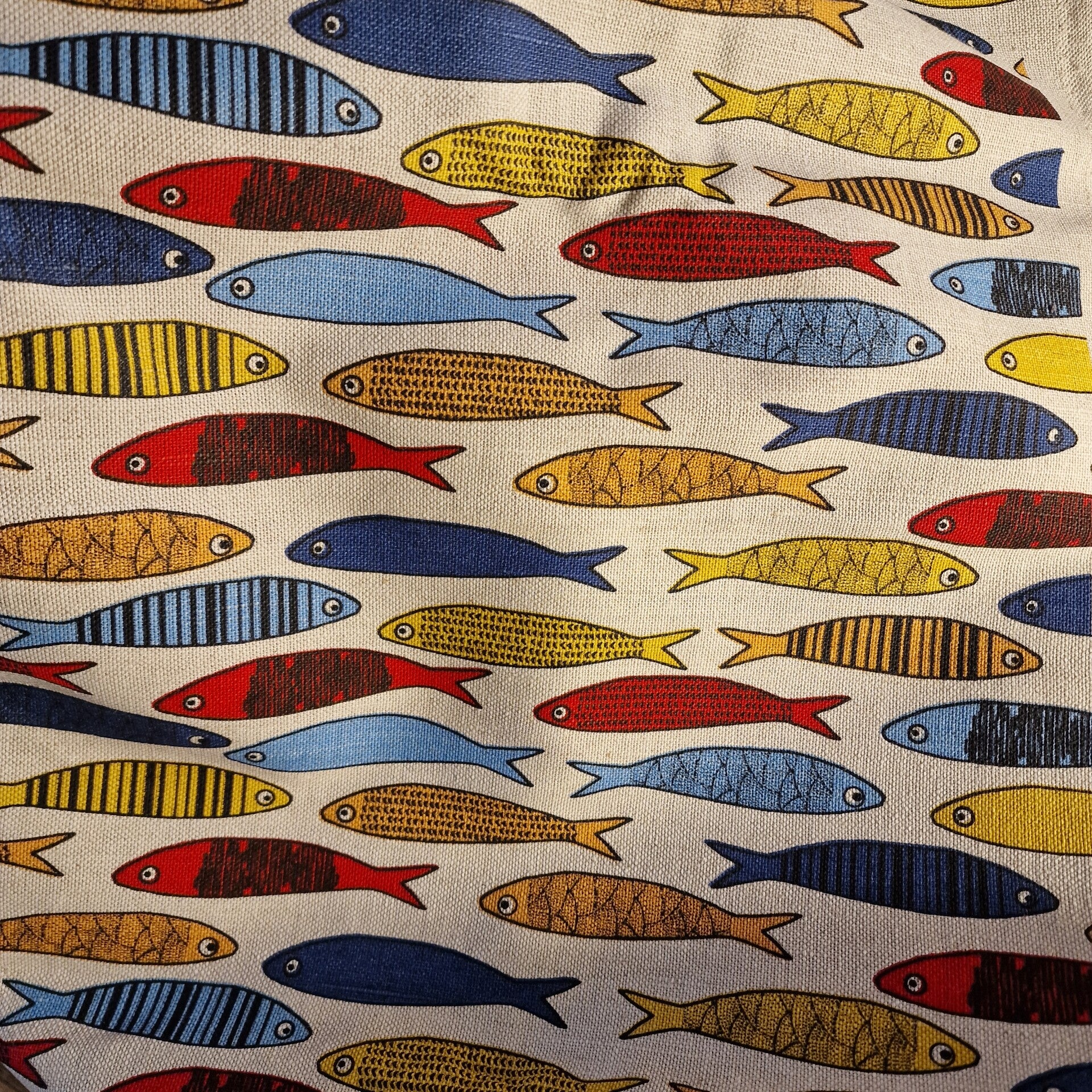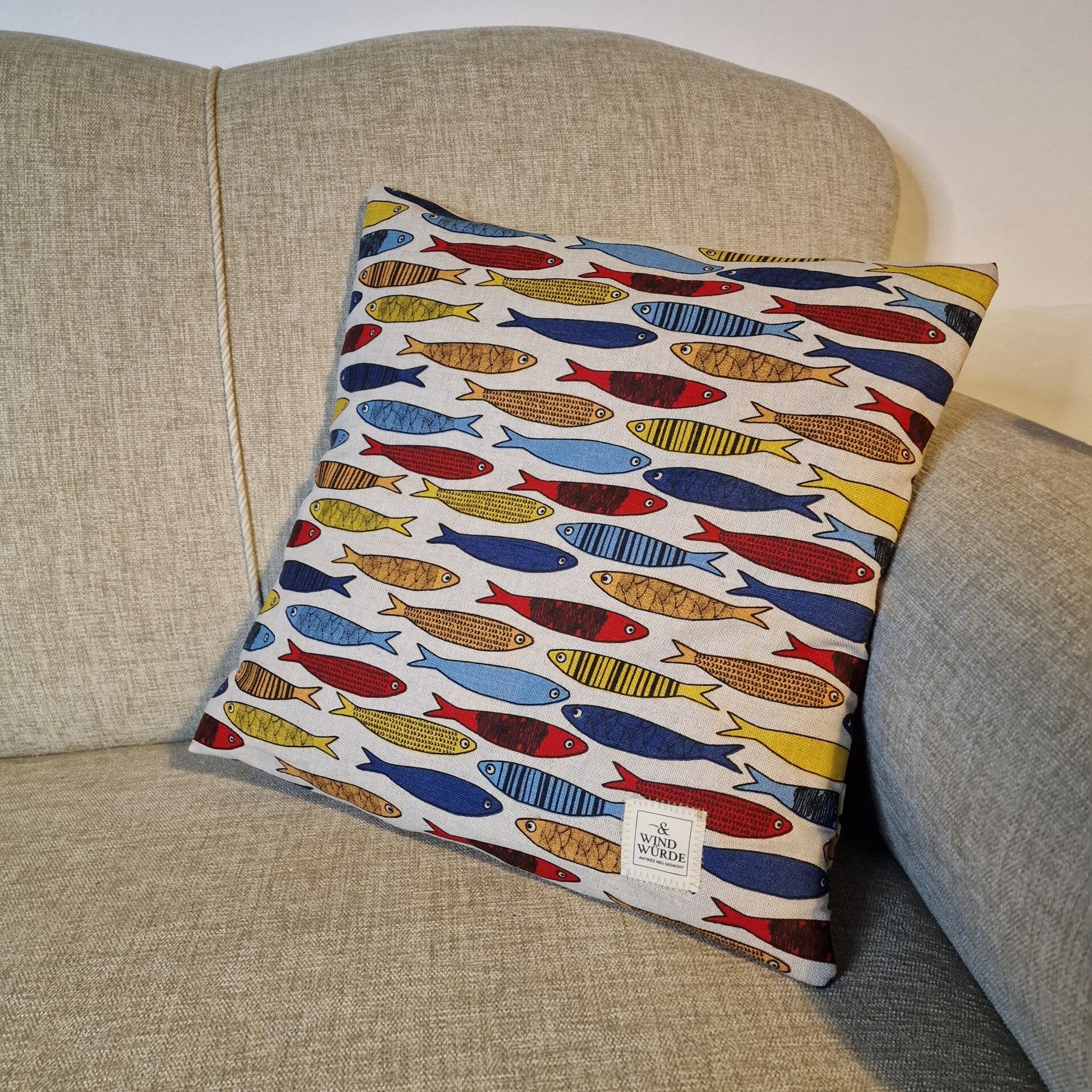 Es ist 40 x 40 xm groß und mit 400 g Seegras gefüllt. Ein Kissen, das einem ein Lächeln ins Gesicht zaubert. Der bunte Fisch-Schwarm ist einfach zu schön.