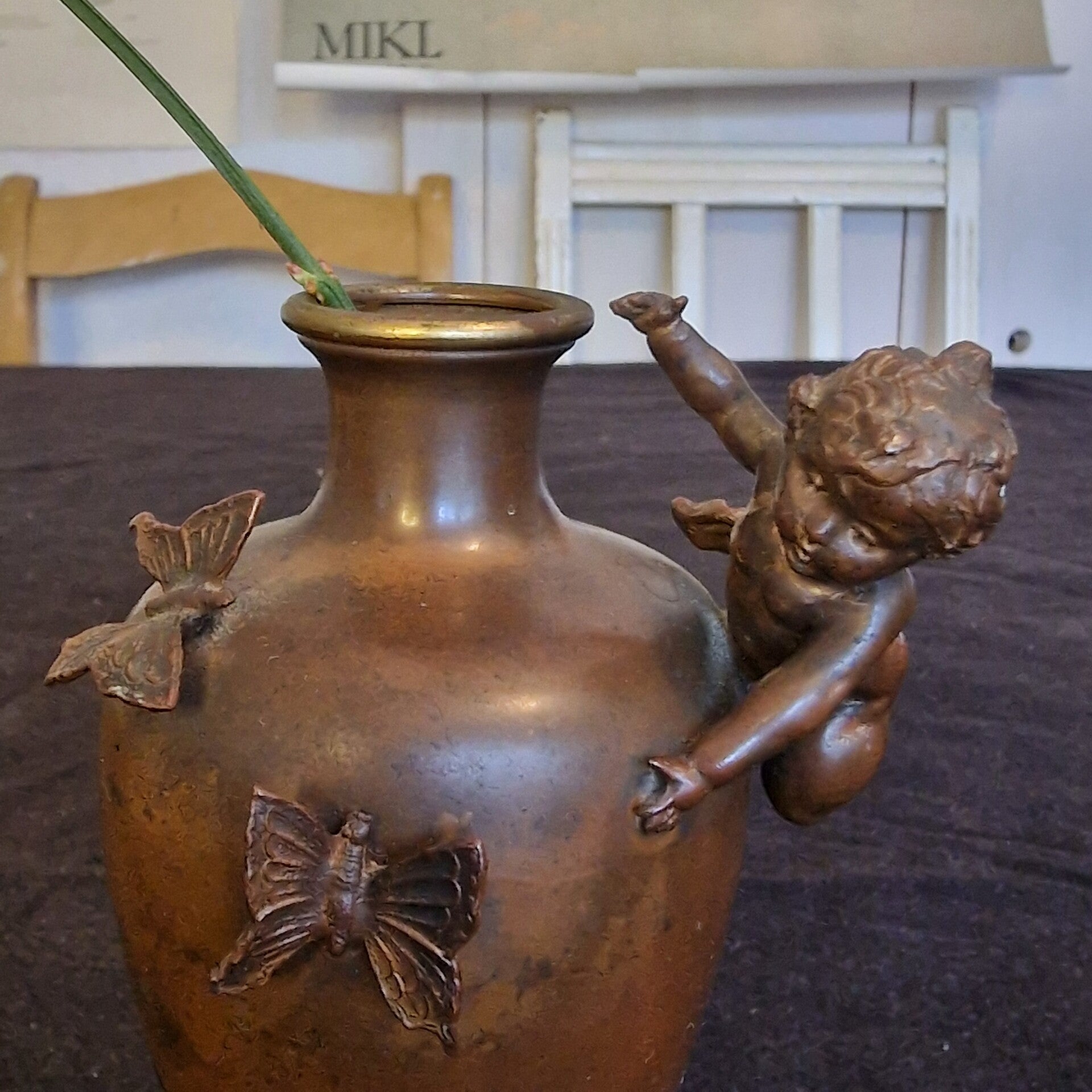 Das Valentinspaket "Putto" besteht aus einer 13,5 cm hohen Jugendstilvase mit aufgestztem Putto, der zwei Schmetterlinge beobachtet; einem Metall-Stövchen (27 cm) mit Durchbruchrand mit zwei passenden Teetassen und einer antiken Schmuckschatulle für eine Halskette.