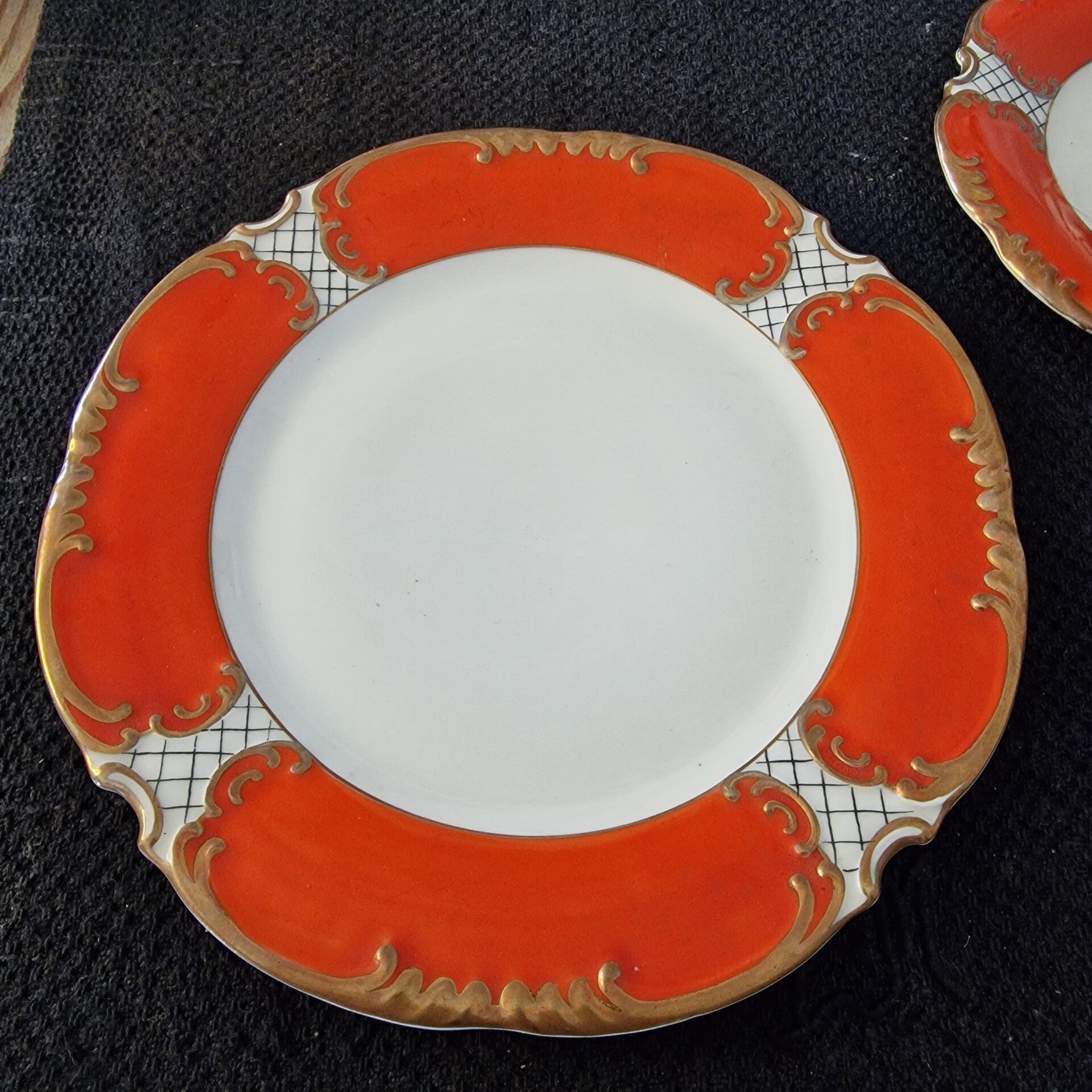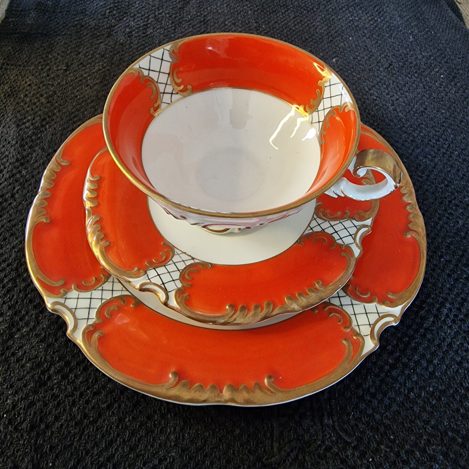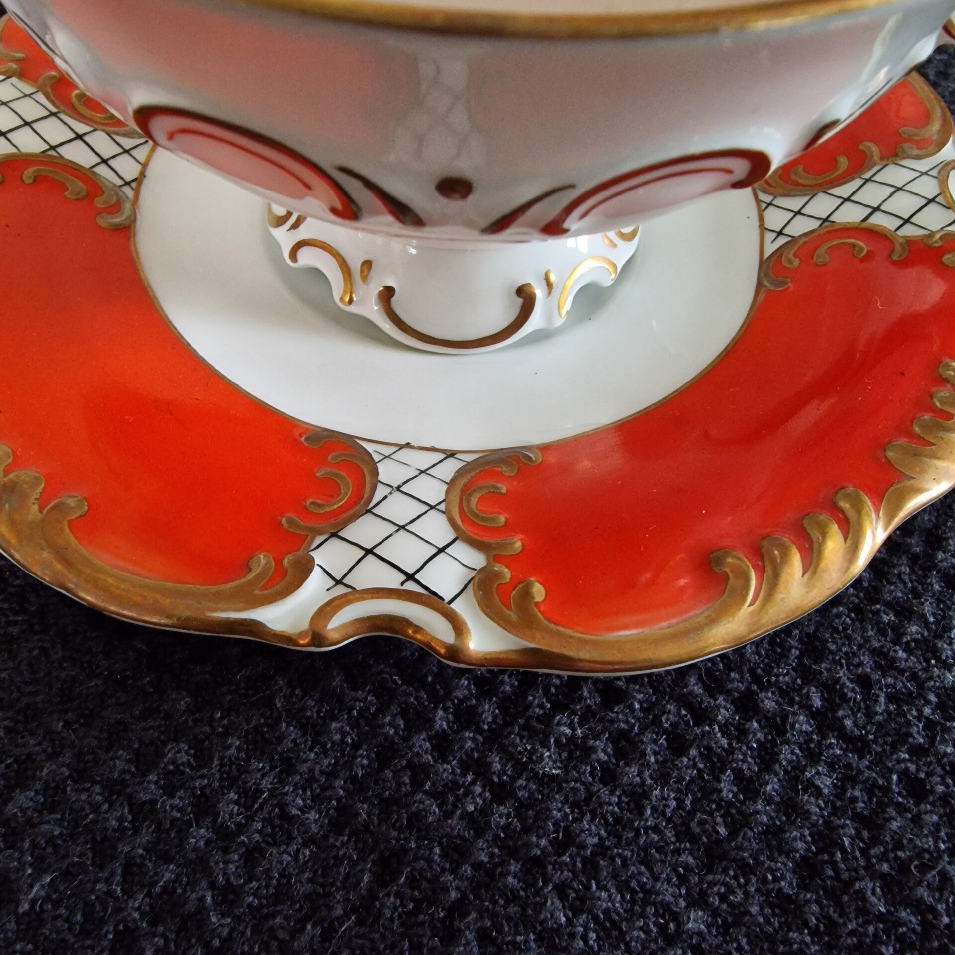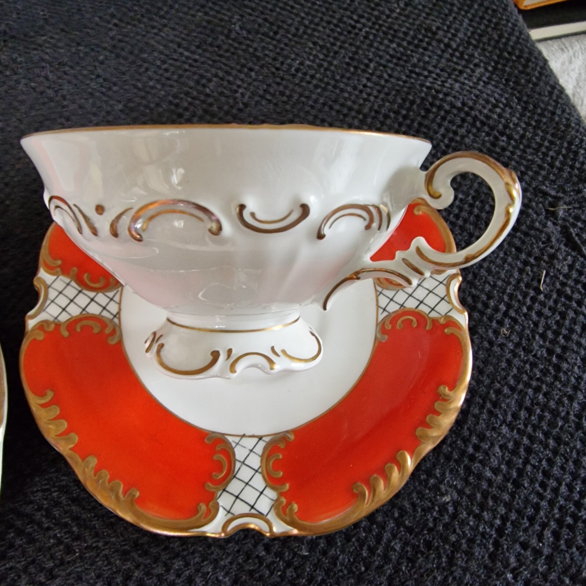 Sammeltasse, leuchtendes orangerotes und goldfarbenes Dekor, Boden: S. W. (Seltmann Weiden) Handgemalt.