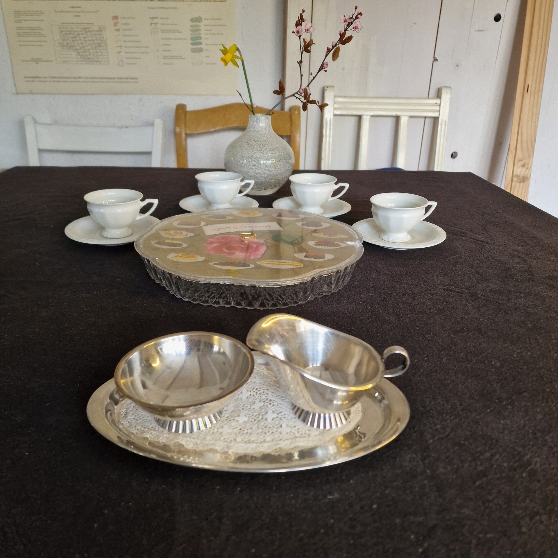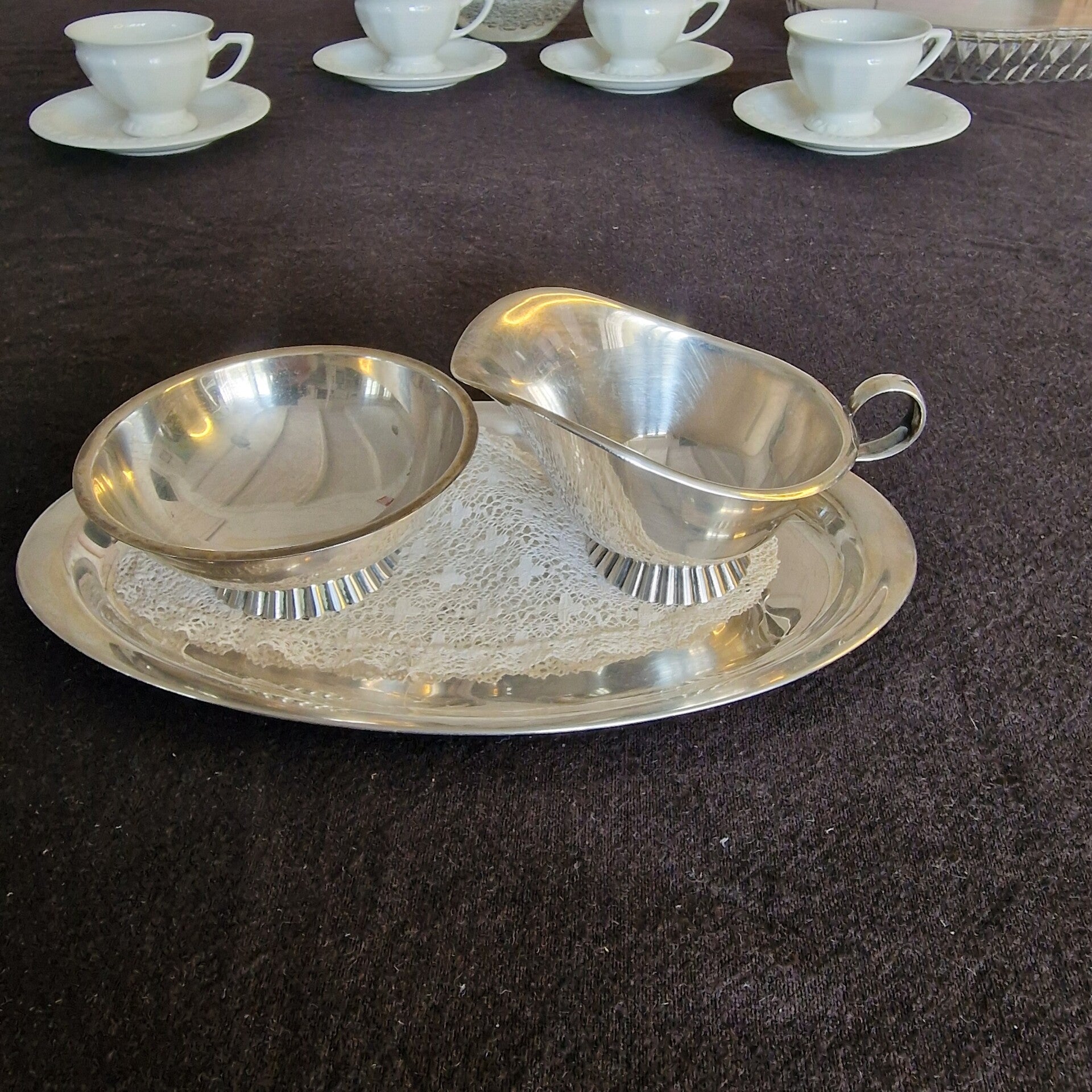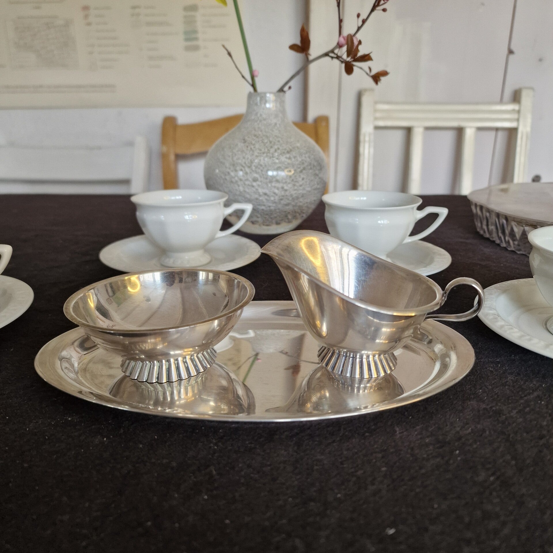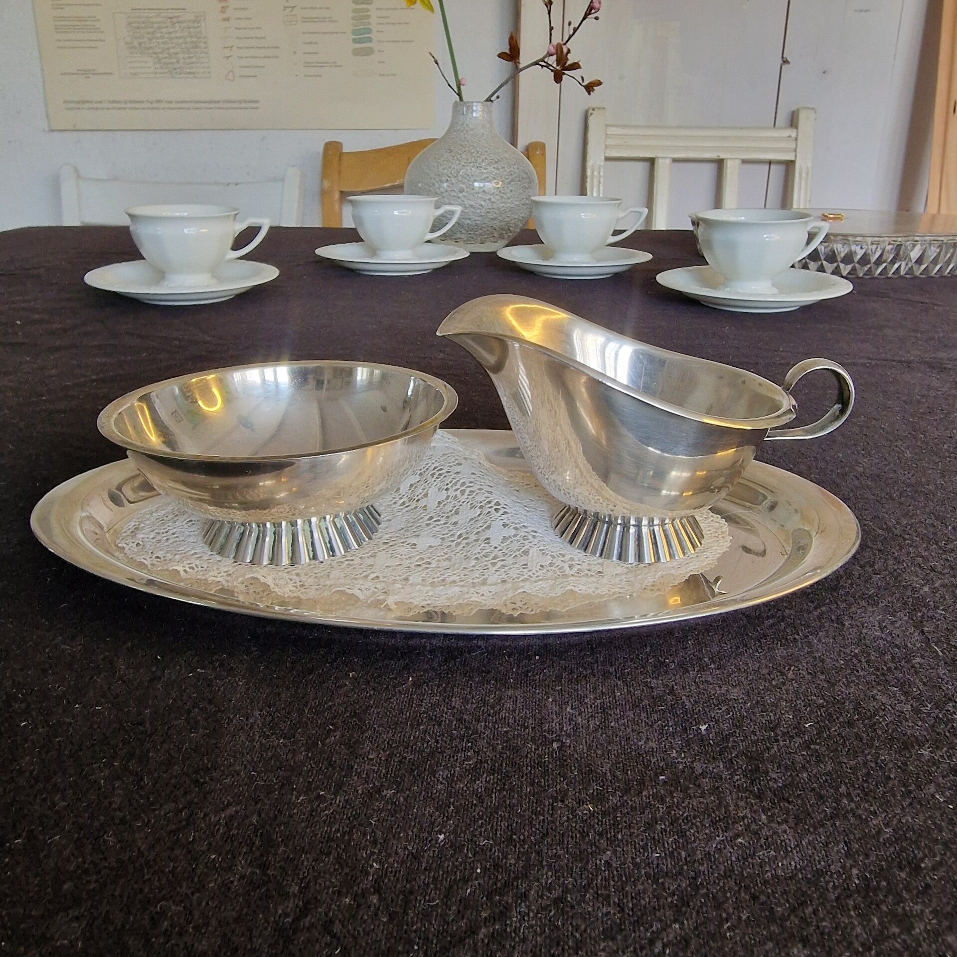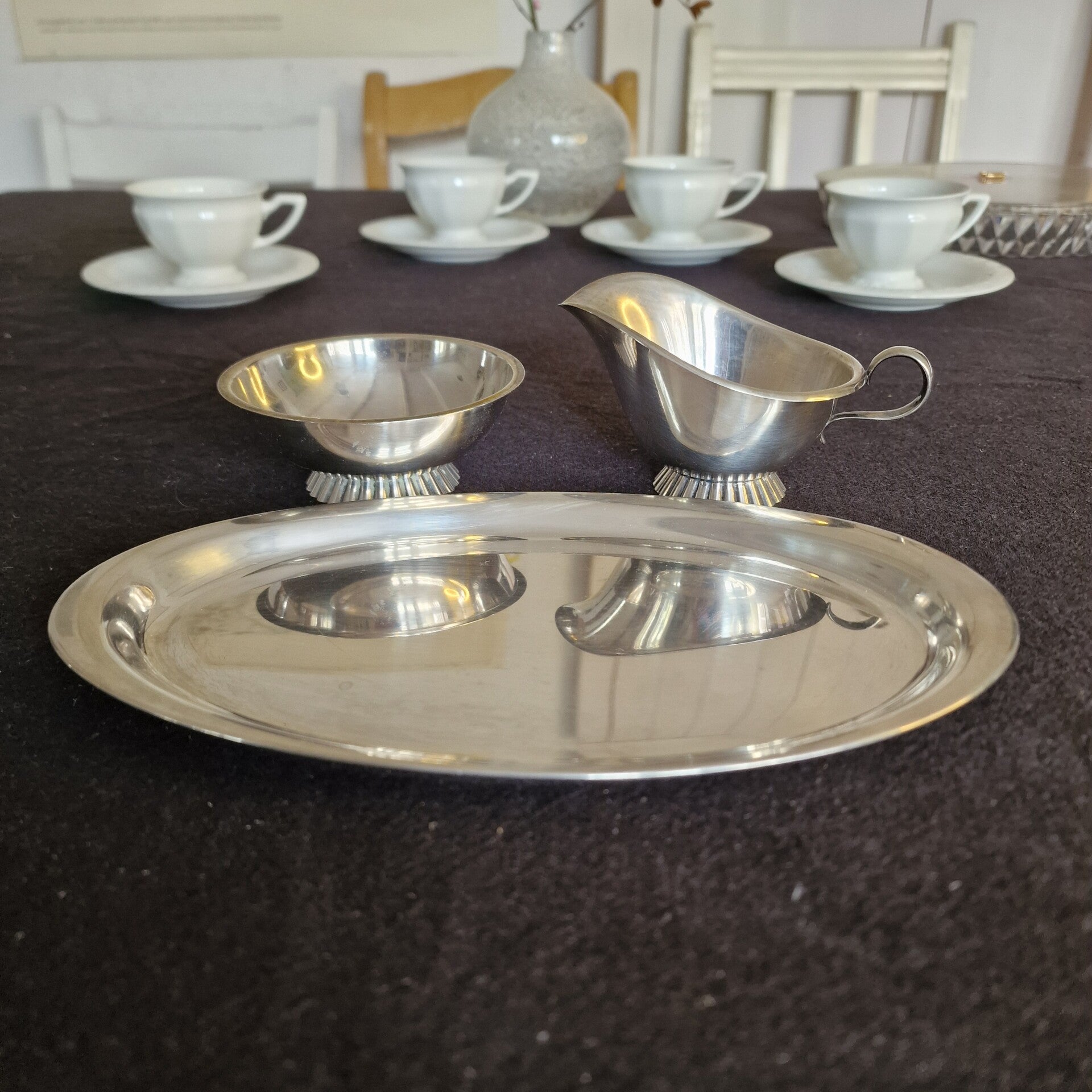 Das Milchkännchen hat eine Höhe von 6 cm an der höchsten und 4 cm an der niedrigsten Stelle, die Zuckeschale hat einen Durchmesser von 9 cm und eine Höhe von 3,80 cm, das Tablett ist 22 cm lang und 12,50 cm breit (es hat Putzstreifen). Das Rahmservice wiegt 210 g.