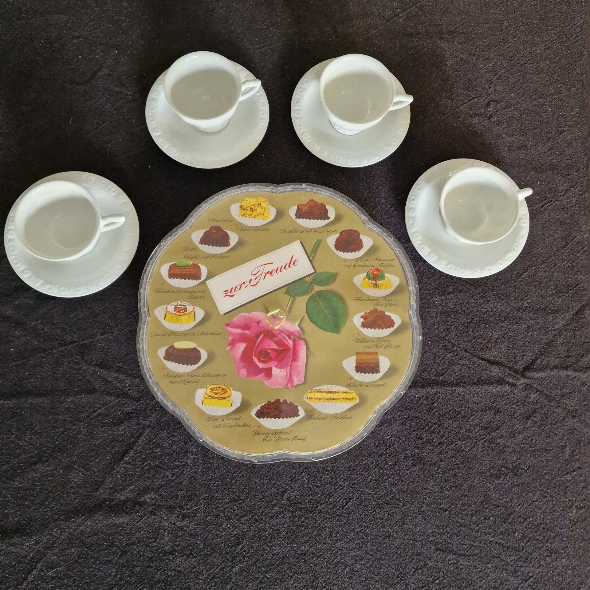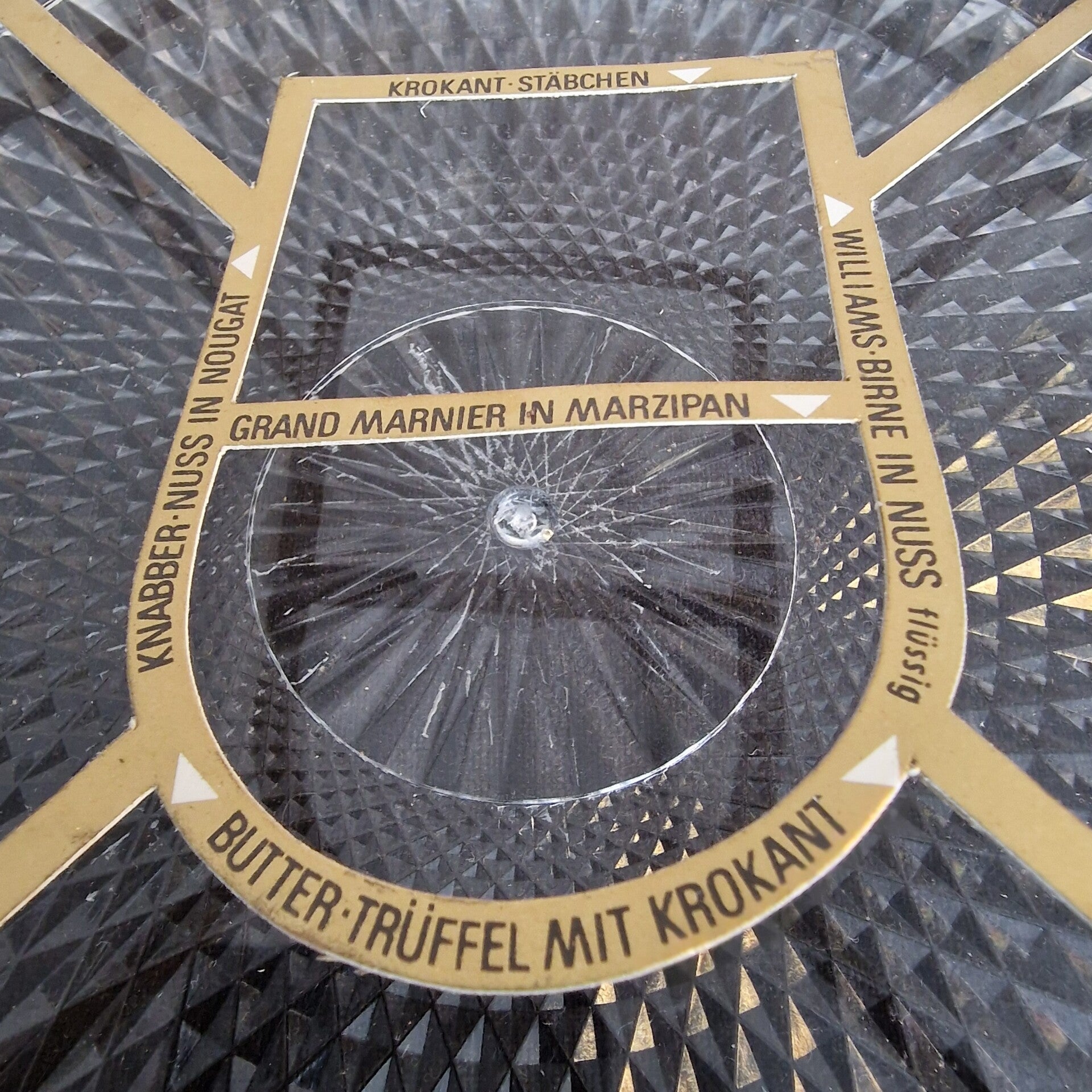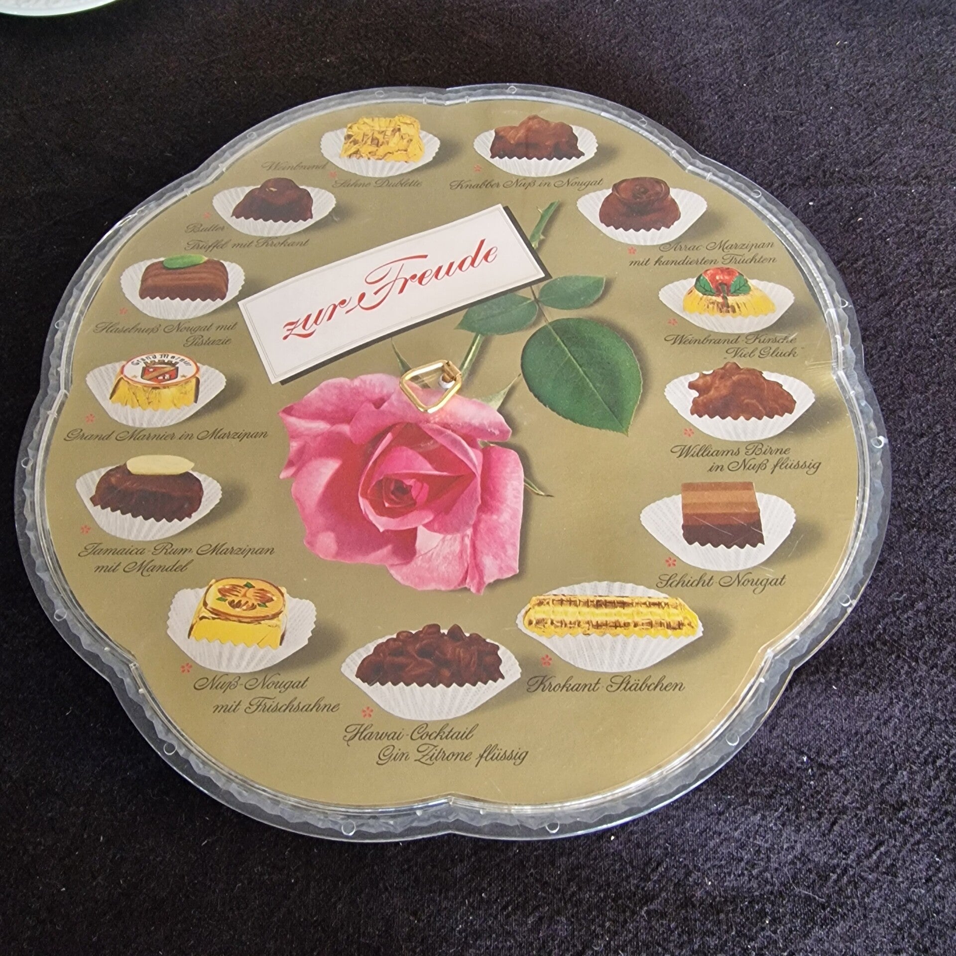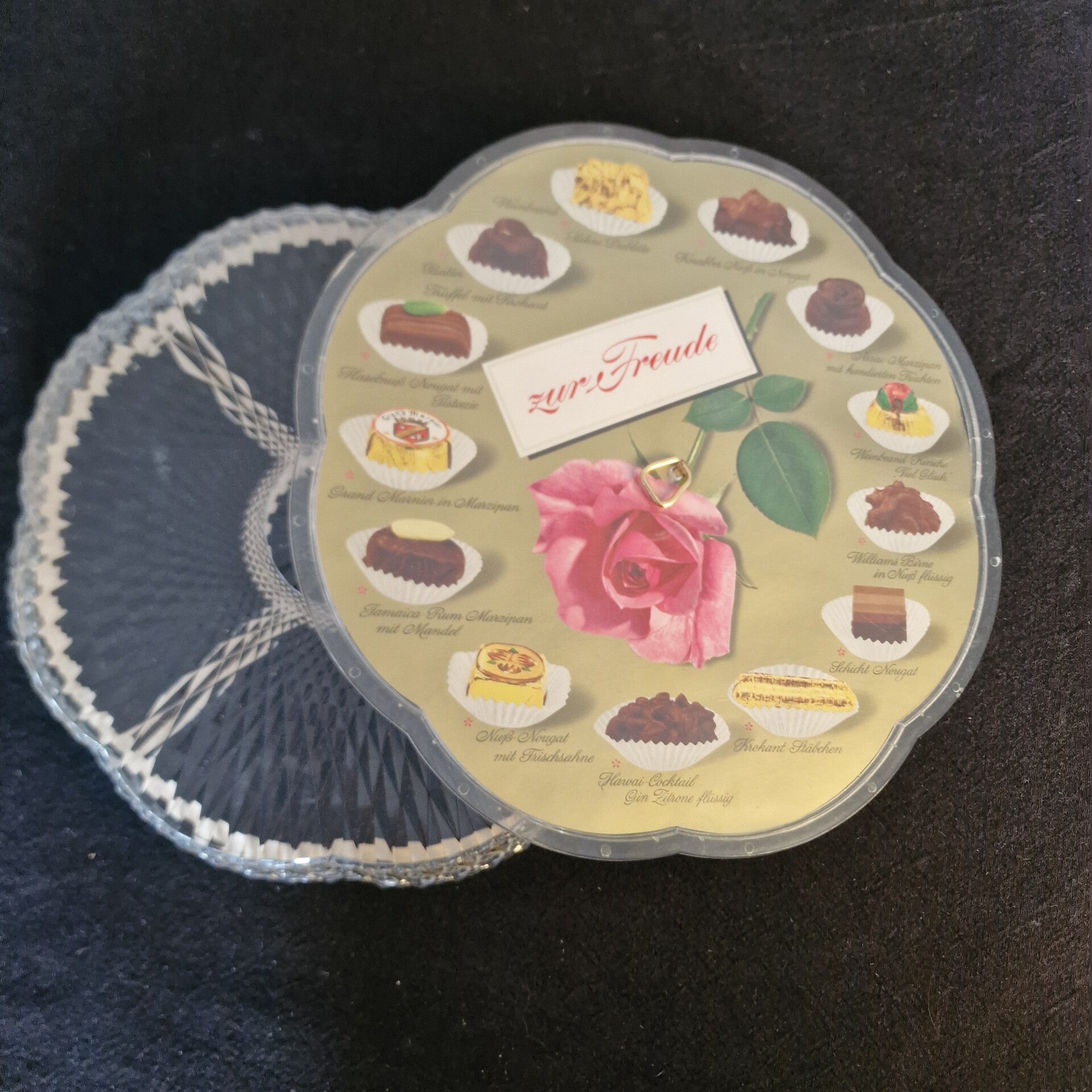 Pralinenschachtel, "Zur Freude", abgerundetes Achteck. Die Kunststoff-Pralinenschachtel mit einem Durchmesser von 26 cm wirkt wie eine Kristall-Deckelschale, eine Pralinen-Marke ist nicht erkennbar. Im Deckel ist ein kleine Messinggriff montiert, die Abteilung aus festerem Papier ist auch noch vorhanden.