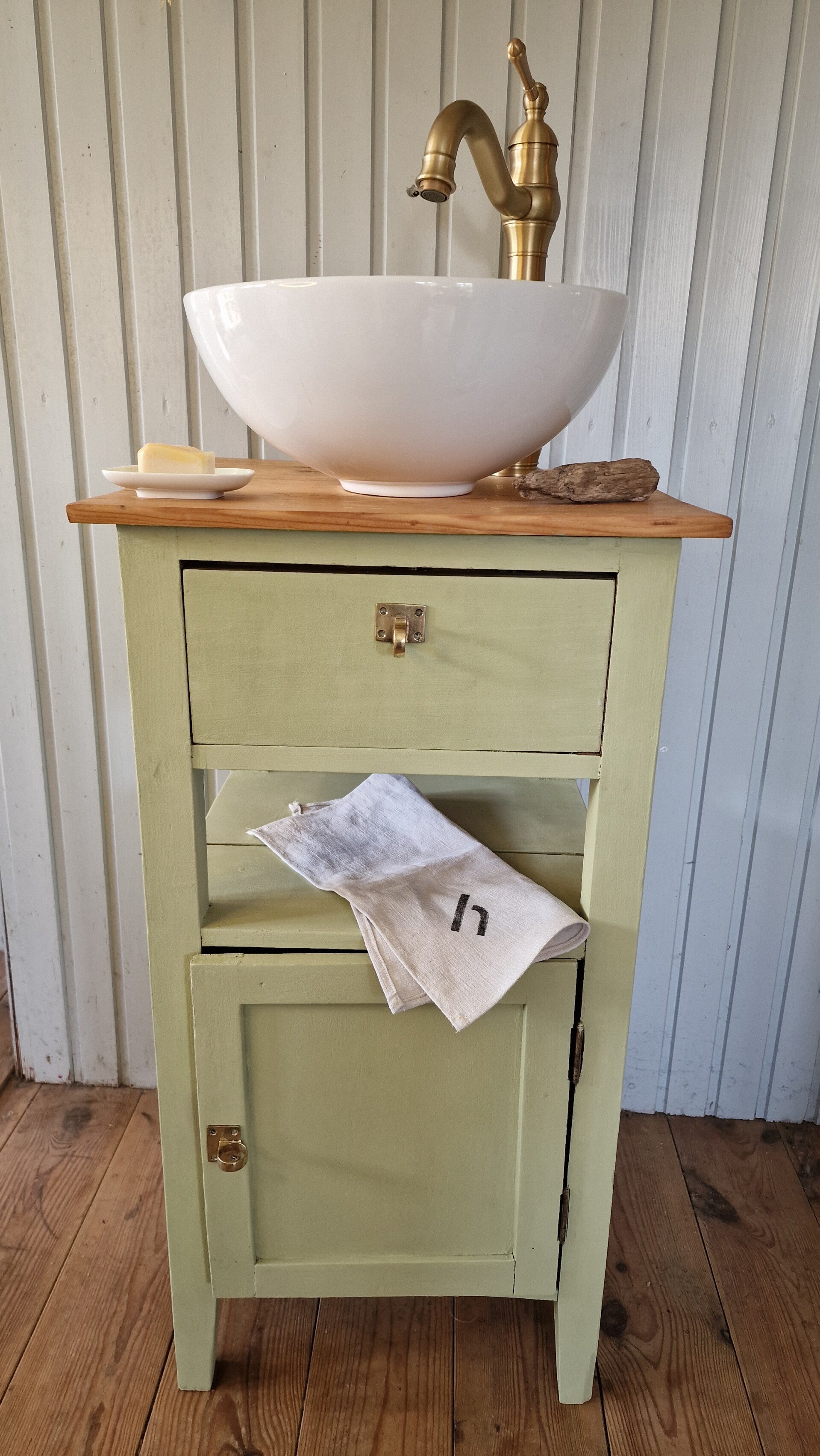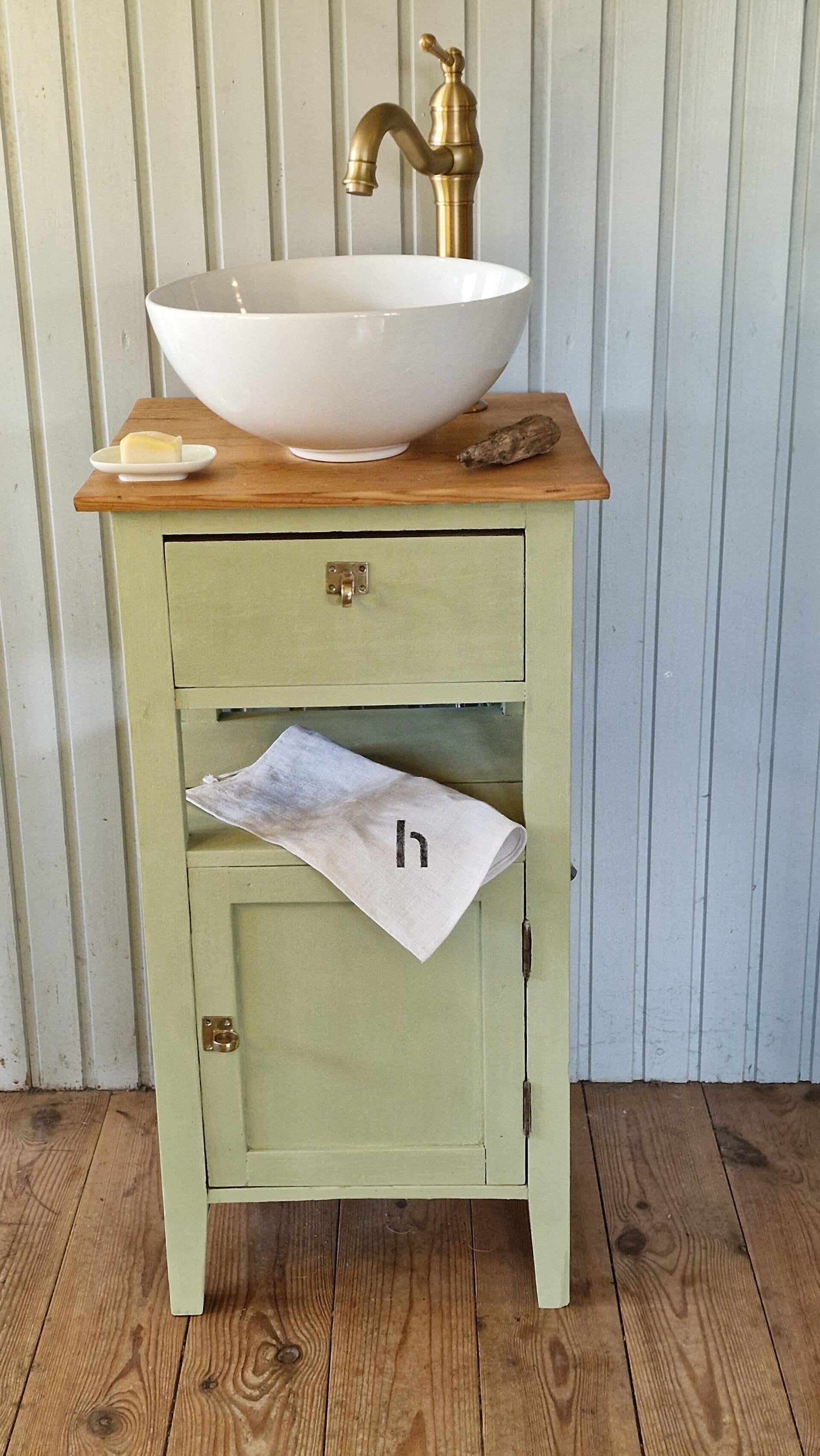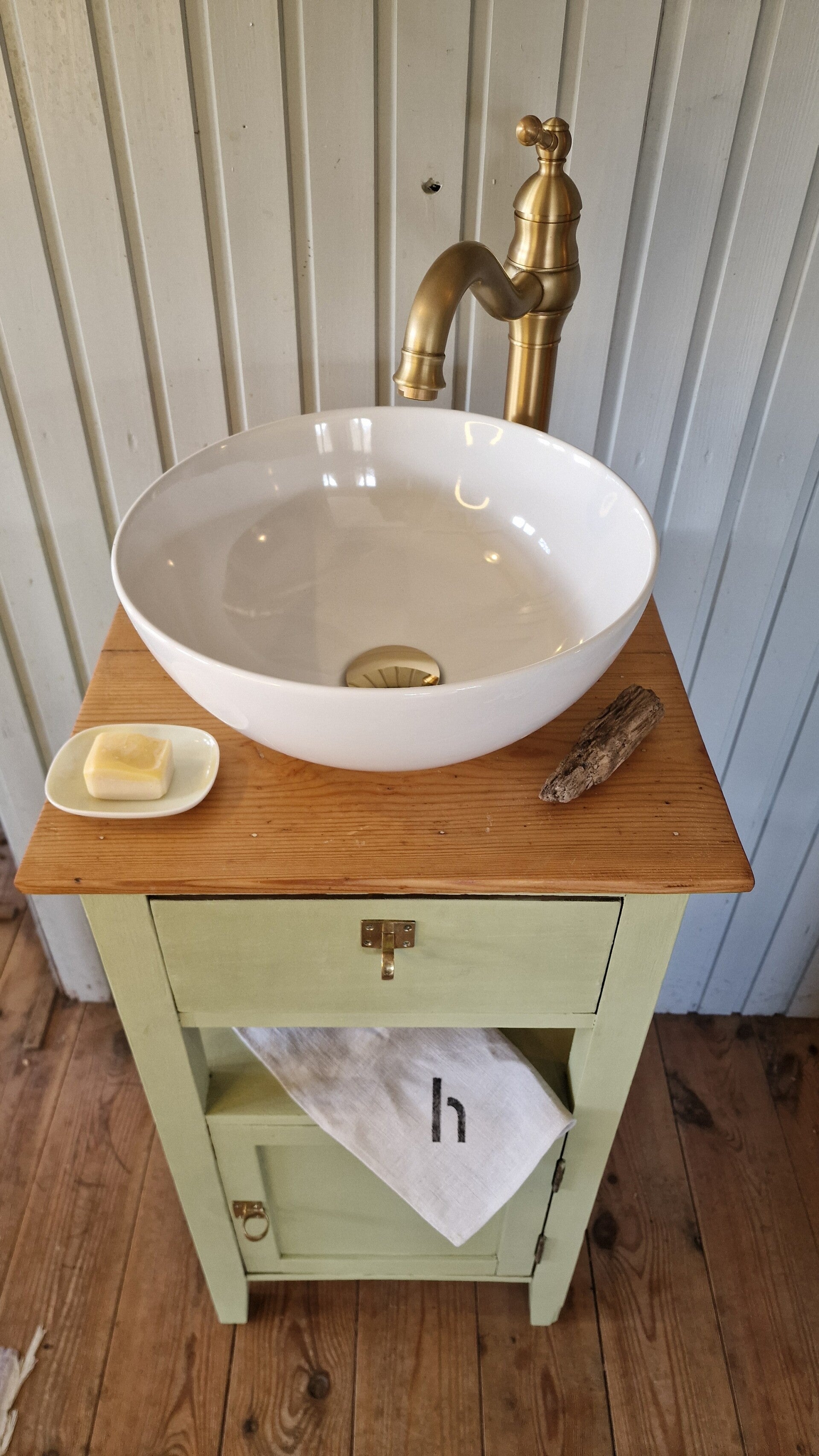 Ein Unikat fürs Bad. Der Warm/Kalt-Wasserhahn im nostalgischen Design ist um 360° schwenkbar. Wir haben ihn mit salbeigrüner Kreidefarbe gestrichen und die Platte versiegelt. Seine Falten (Trocknungsfugen) haben wir absichtlich belassen, damit er seinen Charme nicht verlieret. Die Schublade wurde so angepaßt, dass sie trotz der Installation zu benutzen ist.