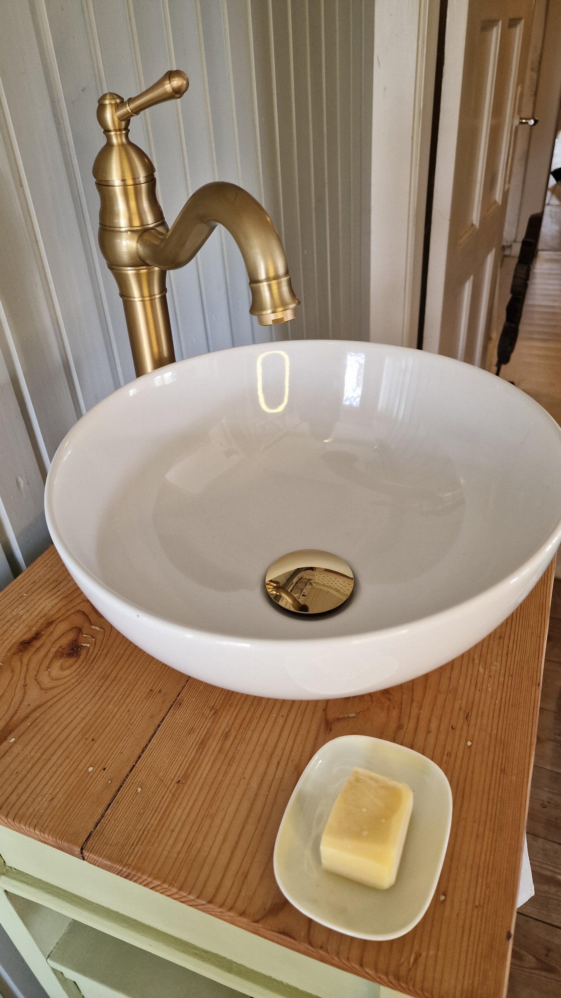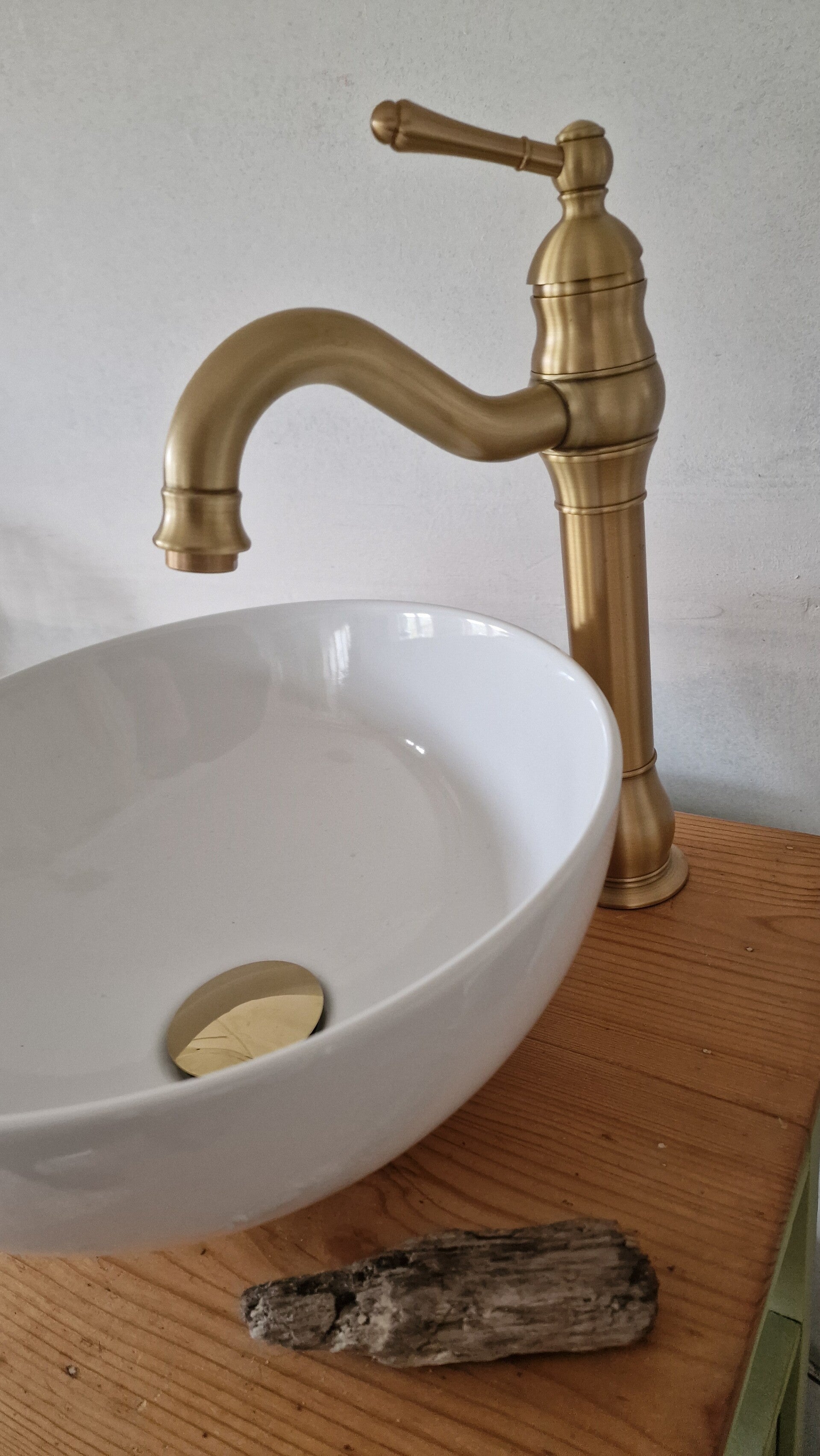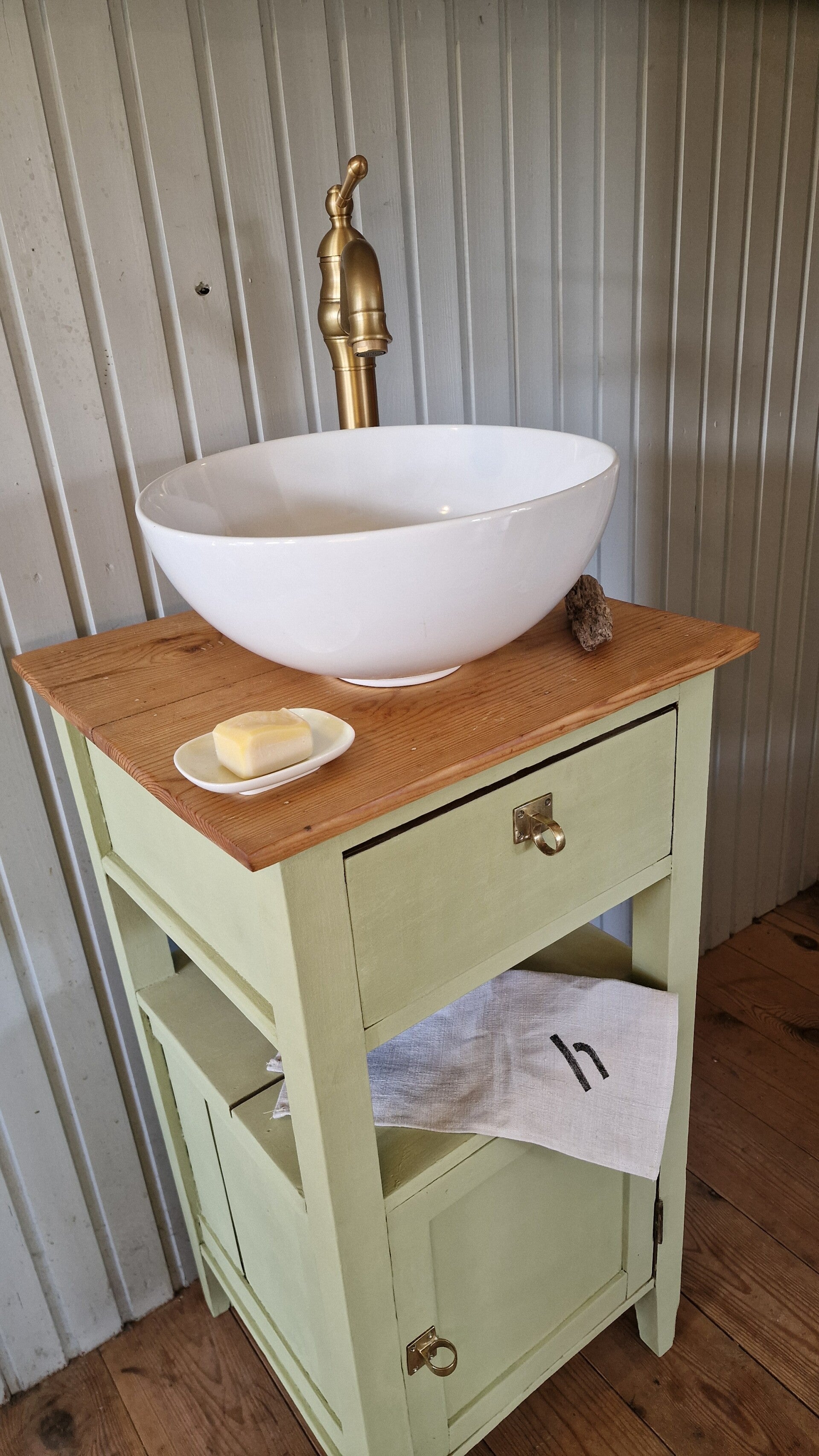 Ein Unikat fürs Bad. Der Warm/Kalt-Wasserhahn im nostalgischen Design ist um 360° schwenkbar. Wir haben ihn mit salbeigrüner Kreidefarbe gestrichen und die Platte versiegelt. Seine Falten (Trocknungsfugen) haben wir absichtlich belassen, damit er seinen Charme nicht verlieret. Die Schublade wurde so angepaßt, dass sie trotz der Installation zu benutzen ist.